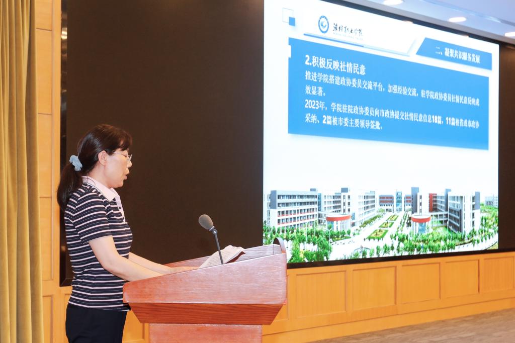 7月4日下午,市政协召开十四届市政协亮绩赛绩成果展示交流会,深入学习贯彻习近平总书记视察山东重要讲话精神,贯彻省委十二届六次全会部署,落实市委十三届六次全会要求。20位市政协委员展示交流了履职成果。 会上,潍坊市十四届市政协委员、潍坊职业学院副院长陈美霞同志,以“不忘初心忠诚履职,努力服务更好潍坊建设”为题,从依托两个学习平台,提升思想理论水平;做好履职三篇文章,凝聚共识服务发展;夯实履职一个基础,促进职教赋能新质生产力三个方面做了精彩汇报,赢得阵阵掌声。 陈美霞表示作为政协委员,将继续秉承服务大局、勇于担当的精神,为更好潍坊建设输送一批批优秀技能型人才,谱写职业教育赋能新质生产力“潍职篇章”。