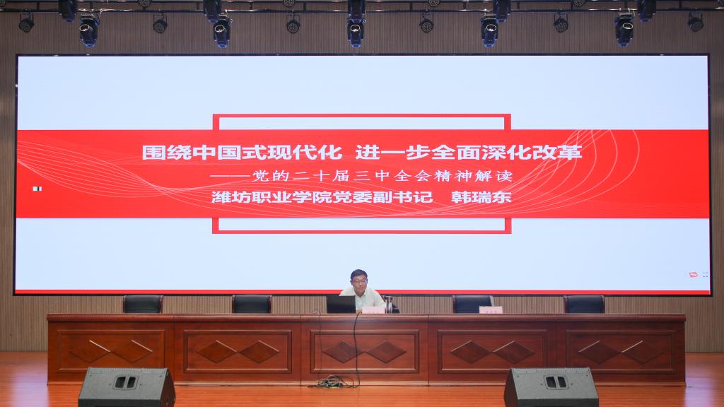 8月19日上午,学院举办宣讲报告会,党委副书记韩瑞东为全体教职工解读党的二十届三中全会精神。报告会在滨海校区综合楼1楼西报告厅设主会场,另设3个分会场,学院领导班子成员、全体教职工参加。 韩瑞东以“围绕中国式现代化 进一步全面深化改革”为题,从深刻认识党的二十届三中全会的主题和重大意义,深刻领会进一步全面深化改革的指导思想、总目标和重大原则,全面准确理解进一步全面深化改革的重大举措,深入贯彻落实全会精神、促进学院高质量发展等方面,对党的二十届三中全会精神进行了深入解读和专题辅导。 他指出,党的二十届三中全会是在以中国式现代化全面推进强国建设、民族复兴伟业的关键时期举行的一次十分重要的会议。学习好贯彻好党的二十届三中全会精神,是当前和今后一个时期全党全国的一项重大政治任务。他强调,全院上下要更加紧密地团结在以习近平同志为核心的党中央周围,凝心聚力、奋发进取,积极投身学院和国家建设,为实现学院冲击双高50强、争办职教本科、争创全国文明校园奋斗目标,以中国式现代化全面推进中华民族伟大复兴而努力奋斗。 宣讲报告聚焦重点和关键,内涵丰富、系统全面,深入浅出、鲜活生动、论述精辟,令参加宣讲报告会的全体教职工深受启迪,备受鼓舞。大家纷纷表示,要把学习贯彻三中全会精神落实到工作实践中去,艰苦奋斗、砥砺前行,团结协作、凝心聚力,为推动学院高质量发展迈上新台阶贡献力量。 【关闭】
