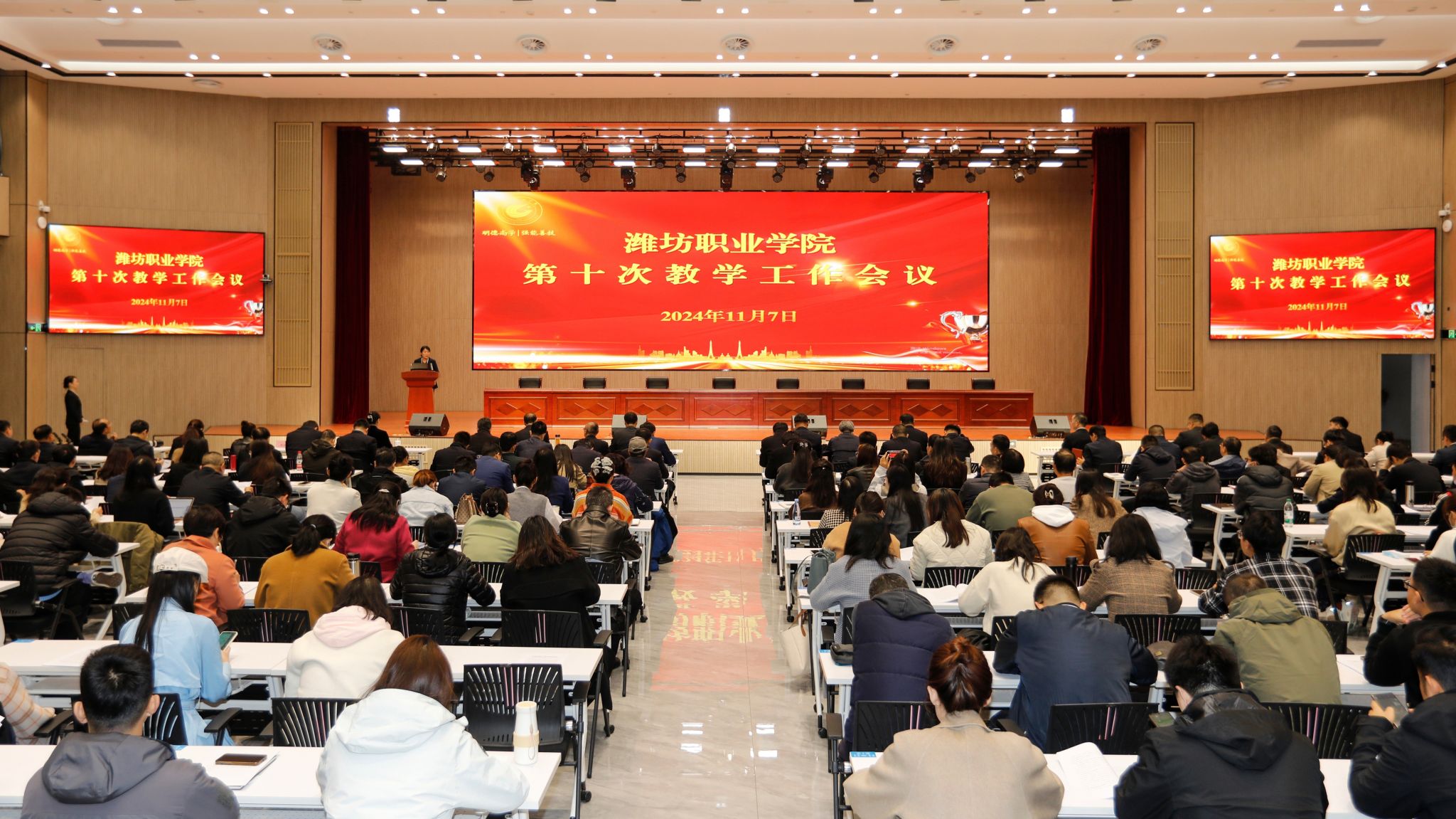 11月7日,学院第十次教学工作会议在滨海校区南区综合楼报告厅举行,学院党政领导班子成员,教师代表400余人参加会议。此次教学工作会议是在深入学习教育强国纲要,全面落实山东省职业院校高质量教学现场会议精神之际召开的,对进一步巩固教学工作中心地位,推进学院高质量发展具有重要意义。 学院高度重视教学工作,自2006年开始召开第一届教学工作会议以来,每两年召开一次,今年是第十次教学工作会议,旨在全面总结前期教学工作成绩与经验,分析形势、查摆问题,明确今后一个时期教学工作的目标与任务,部署教学领域改革思路与重点工作。 会上,王丽卿、梁红英、丁世民、辛海明、马天芳、张晓敏6位优秀教师分别围绕“金专业”“金课程”“金教材”“金师”“金基地”建设和青年教师成长等方面进行了交流分享,充分展示了学院教师的能力和风采。 韩瑞东对6位教师的分享进行了充分肯定,指出他们是学院一大批优秀教师的代表,充分展现了学院在“五金”建设和青年教师培养方面的成绩。他从七个方面提出意见与要求,强调要将省职业院校高质量教学现场会精神落实到教学工作全环节。一是要回归初心,脚踏实地,全面落实立德树人根本任务。二是要坚持优先发展,外引内培,打造德技并修、技艺精湛的双师队伍。三是要紧盯产业,创新人才培养模式,培育专业特色,进一步提升专业服务产业能力,围绕重点产业链打造高水平专业集群。四是要政校行企四元联动,多跨协同,深入推进联合体、共同体工作,重点打造一批样板产业学院,推动产教融合、科教融汇与人才培养高质量协同发展。五是要更新理念,谋划建设专业AI大模型,加大优质数字教学资源开发力度,全过程赋能课堂教学,打造数字教学新生态。六是要教随产出,产教同行,重点打造一批小而美、有成效的精品项目,打造职教出海新品牌。七是要规范教学,健全校院两级教学管理,完善教学标准体系与现代教学治理体系,促进教学质量全面提升。 鞠桂芹作《把井打在教学上,把功夫用在育人上,久久为功实现学院教学工作高质量发展》工作报告,全面总结了两年来学院教学工作取得的成绩,剖析了教学改革面临的新形势新问题,聚焦创建第二轮“双高”校与申办职教本科的办学目标,提出围绕人才培养一个核心,做到“四个坚守”,实施质量提升“七个计划”的“1247”教学工作总体部署,从8个方面29项任务进一步明确了学院教学工作下一步的目标与工作要求。 任培华宣读表扬决定,对两年来在师生竞赛、双创大赛、教学成果奖、教学团队与名师、课程与教材等方面取得优异成绩的团队和个人进行表扬。 付一明就贯彻落实会议精神提出三点要求,一是各部门组织全体教师,认真学习、深刻领会韩书记讲话精神,更新职教理念、深耕教学,并将讲话精神贯彻落实到第二轮“双高”创建、申办职业教育本科等各项重点工作中,以更加昂扬的姿态迎接新挑战。二是各部门要结合韩书记讲话和教学工作报告,对下一步教学工作进行任务细化分解,明确目标和推进措施,加强工作调度,确保按期高质量完成各项工作。三是各教学管理职能部门要搭建各类发展建设平台,牵头做好各项任务的协调、推进,确保各项任务落到实处,取得实效。(韩超 刘凯供稿)