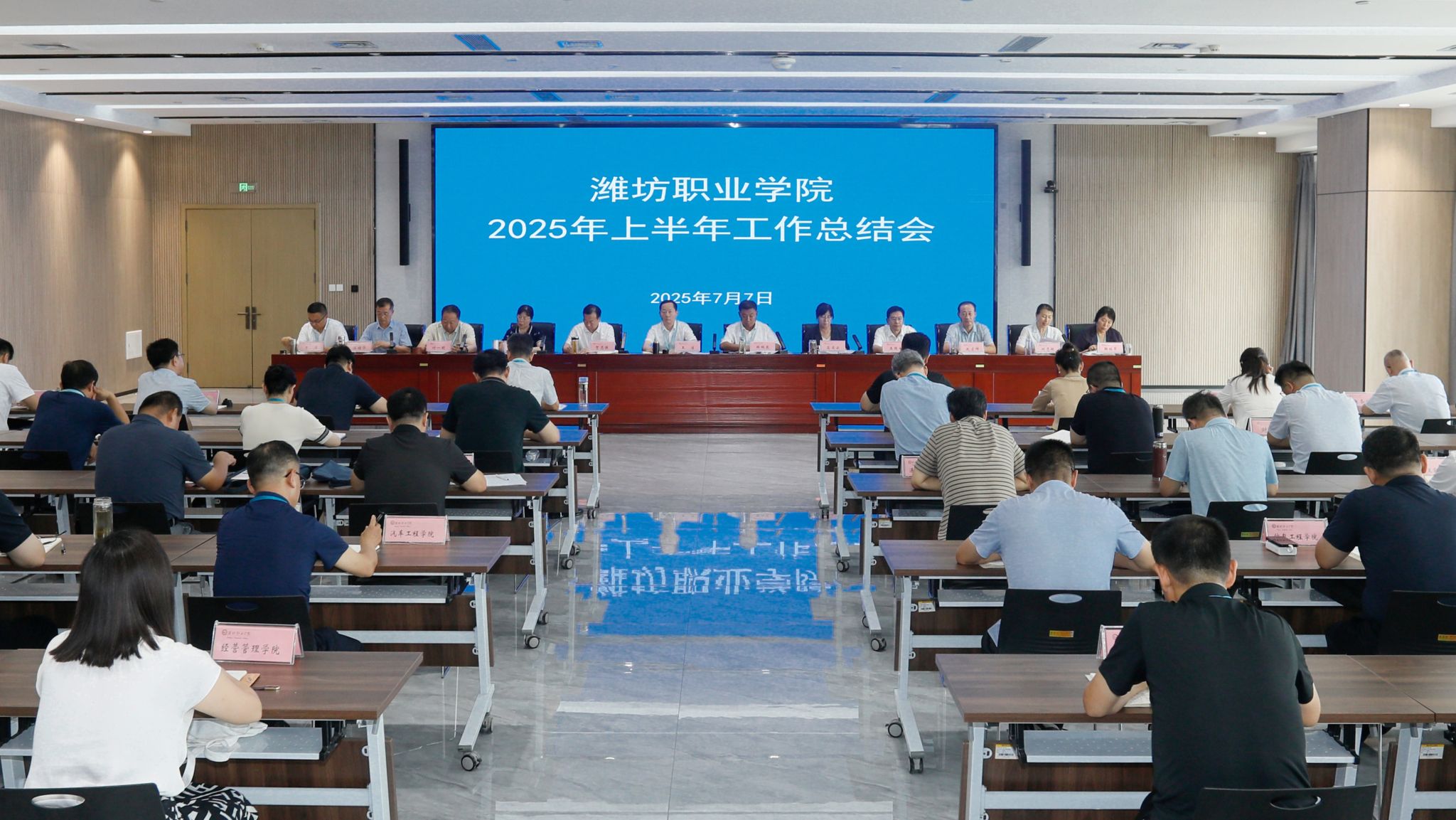 7月7日上午,学院召开2025年上半年工作总结会。学院党委书记王浩出席并讲话,学院其他党政领导班子成员和各职能部门、二级学院党政主要负责人参加。院长韩瑞东主持会议。 王浩讲话。他充分肯定上半年学院工作。他指出,今年以来,学院党委紧紧围绕市委“一七五一”思路目标和任务举措,团结带领全体教职工崇实尚行、敢于争先,党建和事业发展取得新成效、新突破,得到市委、市政府等上级肯定和社会认可。他指出,学院第二次党代会已经胜利召开,为下步工作和“十五五”发展提出了指导意见,下步主要从七个方面入手,认真学习贯彻落实“12359”工作思路和任务举措,推进学院高质量发展。一要坚持立德树人根本任务,在教学、管理、服务及各方面工作中践行为党育人、为国育才初心使命。二要坚持高标准对标学习,拓宽视野,更新理念,攻坚克难,坚决打赢“十四五”收官战,谋划好“十五五”发展。三要坚持深化产教融合、校企合作,以新“双高”建设引领高水平专业(群)建设,紧跟科技革命和产业变革新形势,提升学院服务更好发展匹配度。四要坚持特色发展理念,深化办学改革,增强二级学院支撑学院服务发展的贡献度和辨识度,提升学生、家长、社会及企业满意度。五要增强服务学院发展的紧迫感和使命感,强化能力建设,跟上学院建高升本高质量跨越发展新形势、新要求。六要强化作风建设,主动跳出适应区,增强破釜沉舟、背水一战的胆魄,坚决完成党委工作安排及党代会确定的目标任务。七要强化纪律规矩意识,坚决摒弃经验主义和惯性思维,与时俱进推进规章制度“废改立”,促进各项工作规范化、制度化。他希望学院领导干部带头讲政治,守规矩,精业务,讲方法,负责任,思进取,在学习贯彻落实学院党代会精神、推进学院事业高质量发展上“走在前、挑大梁”,团结带领全体教职工,努力开创学院高质量发展崭新局面。 韩瑞东简要梳理了学院上半年工作亮点工作项目,从“严真细实快”五个方面分析了工作中存在的问题和不足,并对贯彻落实总结会精神提出三点要求。一是抓好会议精神学习贯彻落实。要深入学习领会会议精神,把全体教职工的思想和行动进一步统一到学院党代会和本次会议精神上来,团结带领全体教职工做落实学院党代会“12359”工作思路目标和任务举措的行动派,做“建高升本”高质量跨越发展的实干家。二是抓好年度和“十四五”工作目标任务落实。要对照年度和“十四五”目标任务,认真梳理未完成工作任务,倒排工期,压实责任,狠抓工作落实、责任落实;强化重点工作监督和督查,推动全年和“十四五”圆满收官,为“十五五”发展、实现学院党代会提出的“建高升本”跨越发展目标夯实基础。三是抓好学院安全稳定工作。要切实把安全稳定工作与业务工作紧密结合,做好思想政治工作和安全教育及问题排查整治,切实保障师生生命健康及基本权益,为学院高质量发展创造安全稳定的环境和条件。 会上,学院其他领导班子成员总结了分管、协管工作及联系单位2025年上半年的主要成绩、亮点项目,客观分析了问题与不足,交流了下半年分管、协管等工作打算。
