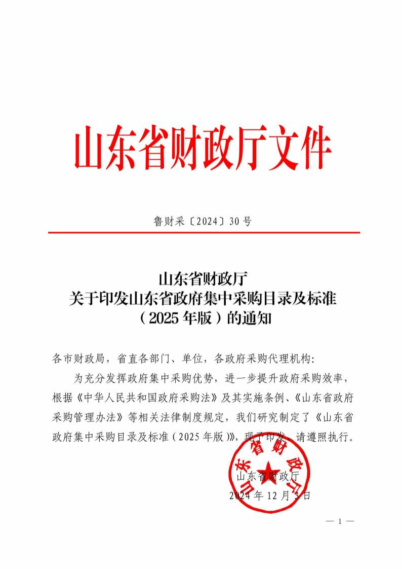 山东省政府集中采购目录及标准 (2025 年版) 一、政府集中采购目录 以下项目应当实行集中采购,按照规定委托集中采购机构代 理组织采购活动: 序号 品目 编码 备注 A 货物类 信息化设备(A02010000) 1 服务器 A02010104 2 台式计算机 A02010105 3 移动工作站 A02010106 4 图形工作站 A02010107 5 便携式计算机 A02010108 办公设备(A02020000) 6 复印机 A02020100 7 投影仪 A02020200 用于测量、测绘等专用投影仪除外。 8 多功能一体机 A02020400 具有多种办公功能的设备,例如带有打印功能的复印 机等。 9 触控一体机 A02020800 包括室内型、户外型触摸屏/互动屏等。 10 A3 黑白打印机 A02021001 11 A3 彩色打印机 A02021002 12 A4 黑白打印机 A02021003 13 A4 彩色打印机 A02021004 14 LED 显示屏 A02021103 15 液晶显示器 A02021104 16 扫描仪 A02021118 17 碎纸机 A02021301 车辆(A02030000) 序号 品目 编码 备注 18 乘用车 A02030500 包括轿车、越野车、小型客车、中型客车、大型客车。 机械设备(A02050000) 19 电梯 A02051227 包括载人电梯、载货电梯、载人载货两用电梯、消防 电梯等。 电气设备(A02060000) 20 21 不间断电源 (UPS) A02061504 家具和用具(A05000000) 22 家具 A05010000 办公用品(A05040000) 23 复印纸 A05040101 信息数据类无形资产(A08060000) 24 基础软件 A08060301 包括操作系统、数据库管理系统、中间件、办公套件 等。 C 服务类 云计算服务(C16040000) 25 C16040000 电信服务(C17010000) 26 网络接入服务 C17010200 仅限于电子政务外网接入服务。 保险服务(C18040000) 27 财产保险服务 C18040102 仅适用于车辆保险。 物业管理服务(C21040000) 28 物业管理服务 C21040000 指本单位物业管理服务部门不能承担的水电供应服 务、设备运行、门窗保养维护、保洁、保安(可并入 物业管理服务采购计划,也可单独备案采购计划)、 绿化养护等的管理及服务。 印刷和出版服务(C23090000) 29 印刷服务 C23090100 指本单位文印部门不能承担的票据、证书、期刊、文 件、公文用纸、资料汇编、信封等印刷业务, 不包括 出版服务。 租赁服务(C23110000) 30 车辆及其他运输 机械租赁服务 C23110300 仅限于公务用车租赁服务。 序号 品目 编码 备注 维修和保养服务(C23120000) 31 车辆维修和保养 服务 C23120301 32 车辆加油、添加燃 料服务 C23120302 注:①以上品目和编码按财政部《政府采购品目分类目录》(财库 〔2022〕31 号)制定和解释; ②本目录中家具、物业管理服务、印刷服务不适用于驻济外省直单 位; ③驻鲁以外省直单位采购全部为分散采购。 二、分散采购限额标准 政府集中采购目录以外单项或批量采购金额(同一二级品目 年度累计)达到分散采购限额标准的项目,依法实行分散采购, 采购人可委托采购代理机构组织采购或自行组织采购。全省分散 采购限额标准如下: 全省分散采购限额标准表 单位:万元 区划级次 货物 服务 工程 省级、济南市本级 150 150 150 市级、济南县级、青岛县级 50 50 60 县级(不含济南、青岛) 30 30 60 政府集中采购目录以外且未达到分散采购限额标准的采购 项目,不适用《中华人民共和国政府采购法》(以下简称政府采 购法)及其实施条例的有关规定,由采购人按照预算管理规定、 单位内控制度等自行组织实施。 三、公开招标数额标准 (一)货物和服务项目。单项或批量采购预算金额(同一预 算项下同一采购品目累计)达到公开招标数额标准的,应当通过 公开招标方式实施。因特殊情况拟采用非招标采购方式的,应按 照采购方式适用情形,在采购活动开始前,获得省、设区的市财 政部门或财政部门授权的主管预算单位的批准。具体公开招标数 额标准如下: 公开招标数额标准表 单位:万元 级次 货物 服务 省级、济南,青岛市本级 400 400 市县级(不含济南) 200 200 (二)建设工程项目。政府采购工程项目,应按照工程建设 内容和规模,分别适用政府采购法及其实施条例和《中华人民共 和国招标投标法》(以下简称招标投标法)及其实施条例。其中, 达到《必须招标的工程项目规定》(国家发展和改革委员会第 16 号令)的限额标准以上的建筑物和构筑物的新建、改建、扩建及 其相关的装修、拆除、修缮项目,以及与构成工程不可分割且为 实现工程基本功能所必需的设备、材料等货物和为完成工程所需 的勘察、设计、监理等服务,均应当按照招标投标法及其实施条 例有关要求,通过公开招标或邀请招标方式组织采购活动。 与建筑物和构筑物的新建、改建、扩建无关的装修、拆除、 修缮,以及未达到《必须招标的工程项目规定》的限额标准的建 筑物和构筑物的新建、改建、扩建工程,均应当按照政府采购法 及其实施条例规定,由采购人根据项目需求特点,依法选择竞争 性谈判、竞争性磋商、单一来源采购方式,或者通过网上商城组 织采购。 当前,《必须招标的工程项目规定》限额标准: 工程为施工 单项合同估算价 400 万元以上,货物为单项合同估算价 200 万元 以上,服务为单项合同估算价 100 万元以上。 四、集中采购 (一)政府集中采购。政府集中采购目录中的集中采购项目, 采购人应当委托集中采购机构代理组织采购活动。市政府采购中 心无区县分支机构的,应当依法代理全区划内集中采购项目。 政府集中采购目录中各品目集采模式如下: 台式计算机(A02010105)、移动工作站(A02010106)、图 形工作站(A02010107)、便携式计算机(A02010108)、多功能 一体机(A02020400)、A3 黑白打